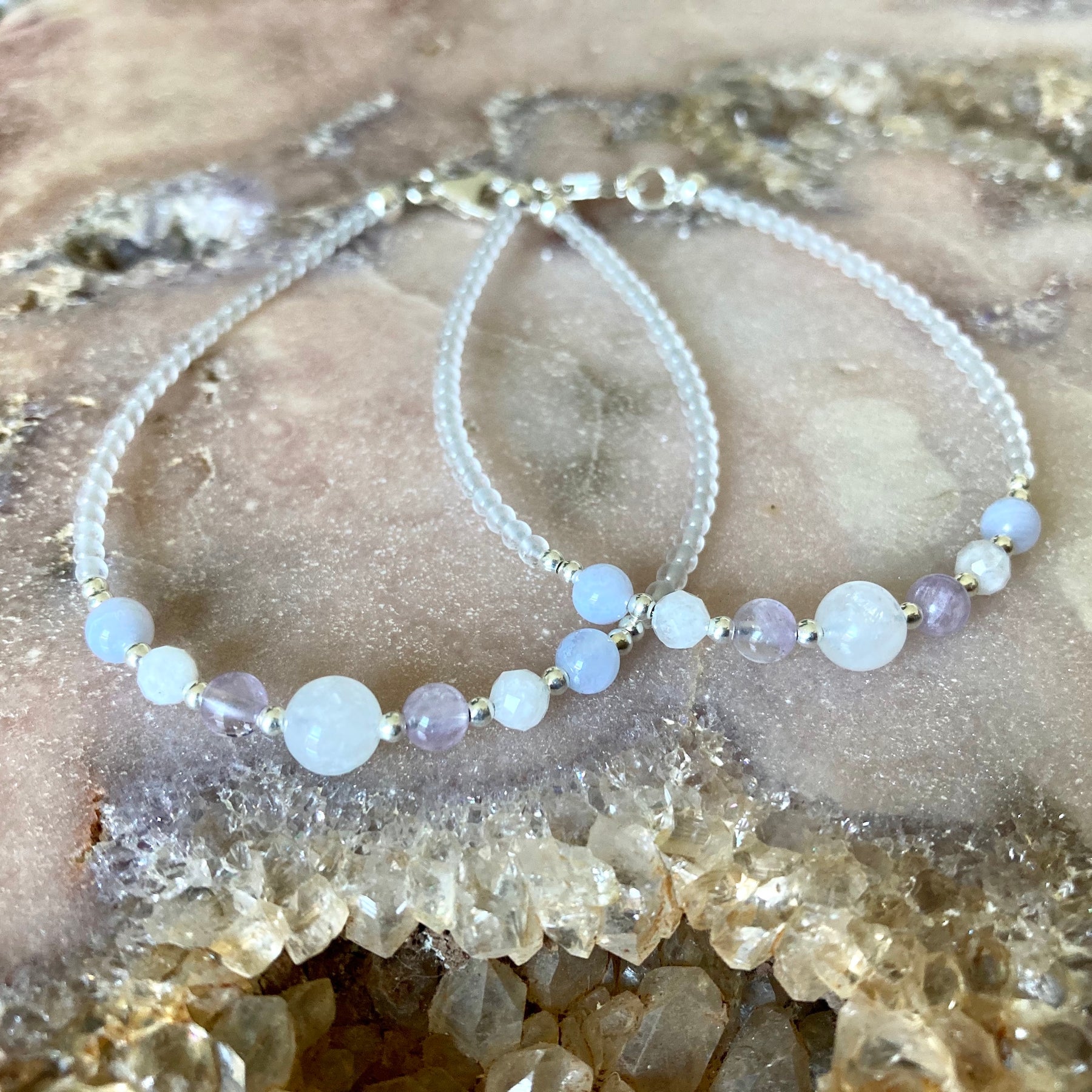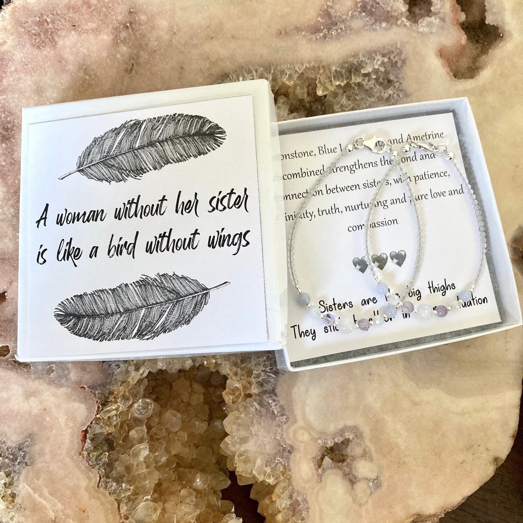 Moonstone, Blue Lace Agate and Ametrine combined strengthens the bond and connection between sisters, with patience, femininity, truth, nurturing and pure love and compassion 💖💖💖