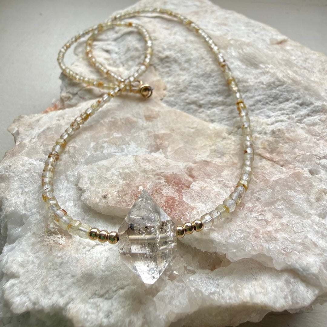 Golden Seeker Of Light Herkimer Diamond & Rutilated Quartz Necklace