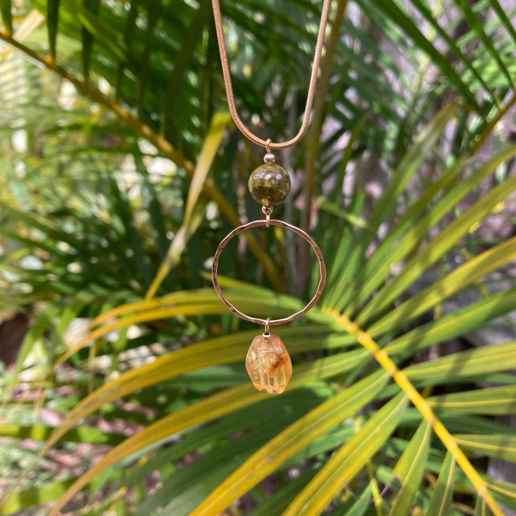 What a beautiful combination for you Meredith, Green Garnet is such a nurturing gem stone and the Amber fascination I can totally understand, it's mesmerising and uplighting, we are so glad you love it and it's one of a kind so it was literally made for you, enjoy x