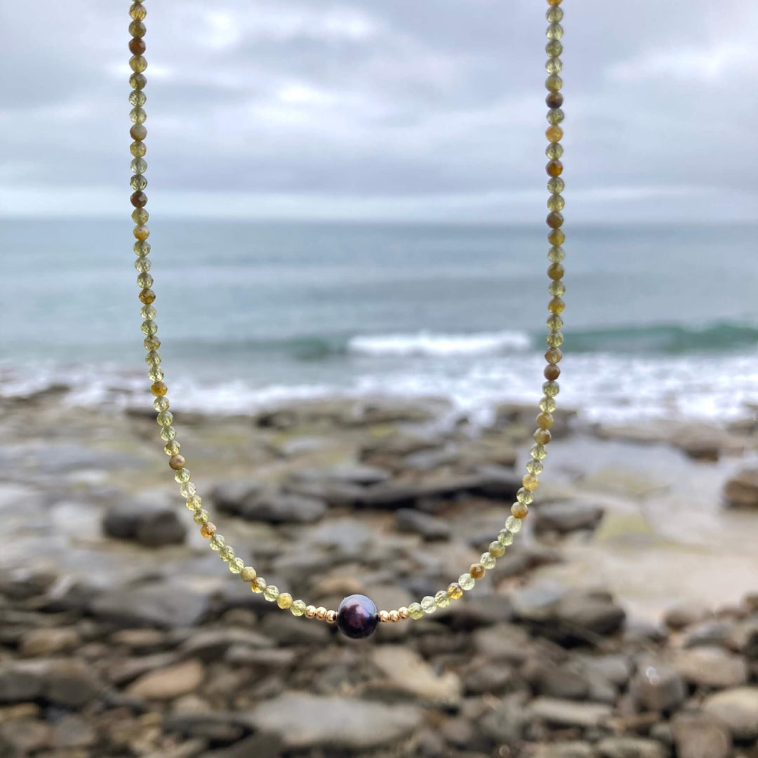 One Of A Kind Green Garnet & Black Pearl Gold Necklace