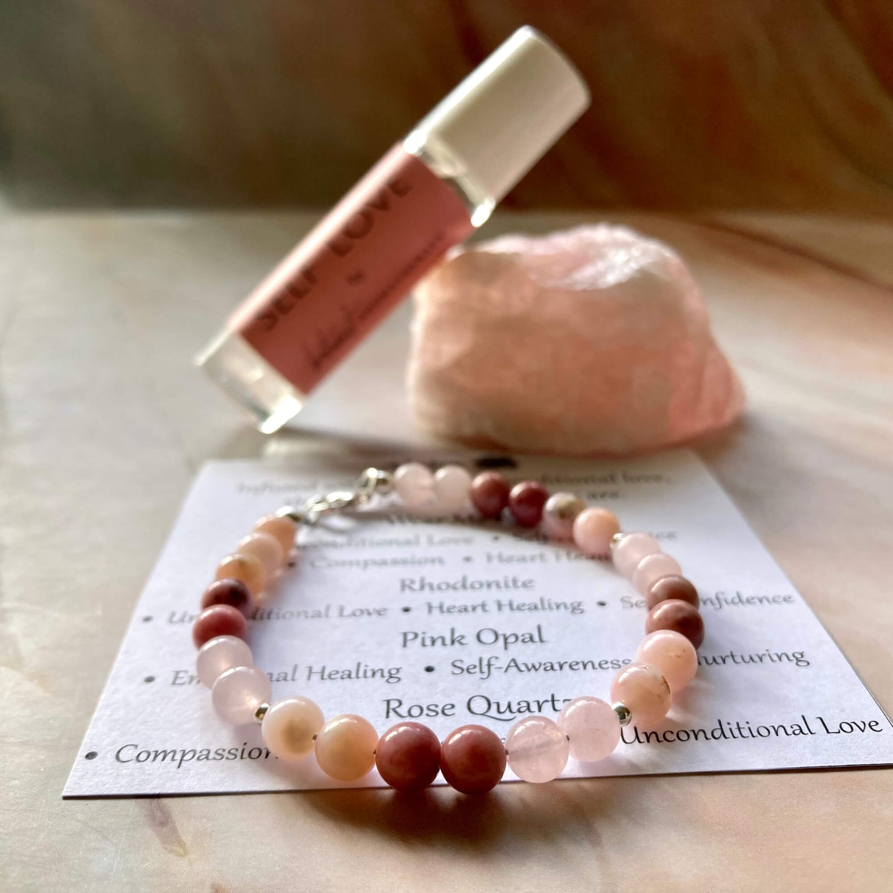 10mL ingredients: fractionated coconut oil, rose quartz, bergamot, lavender, frankincense, ylang-ylang, coriander, fir needle, geranium.