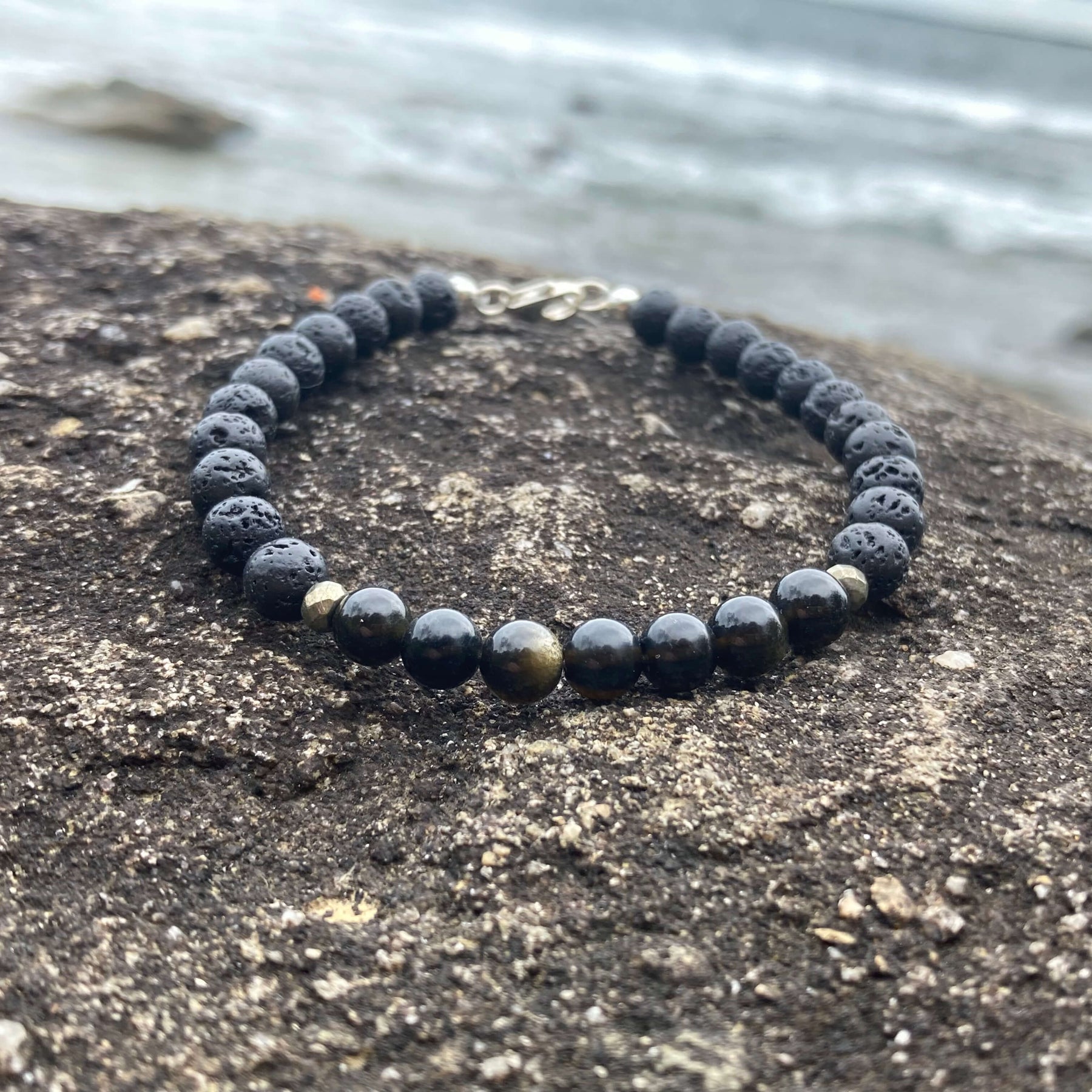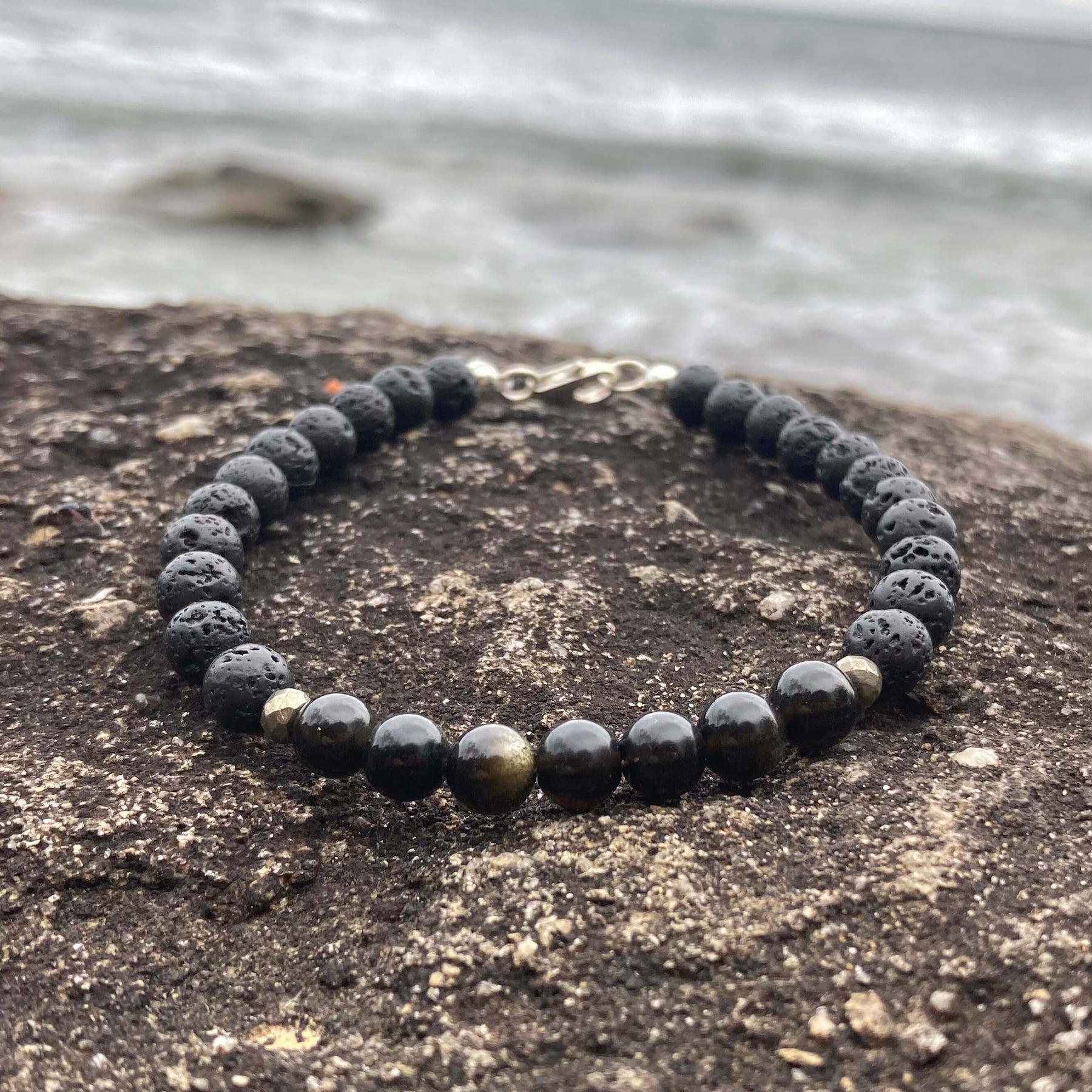 We finish this men's bracelet off with Lava Rock beads so that you can add essential oils for that extra boost of empowerment. Lava Rock is a natural essential oil diffuser bead, add a few drops of your favourite oil, the beads soak in the oil and your body heat aids in gently diffusing the scent.